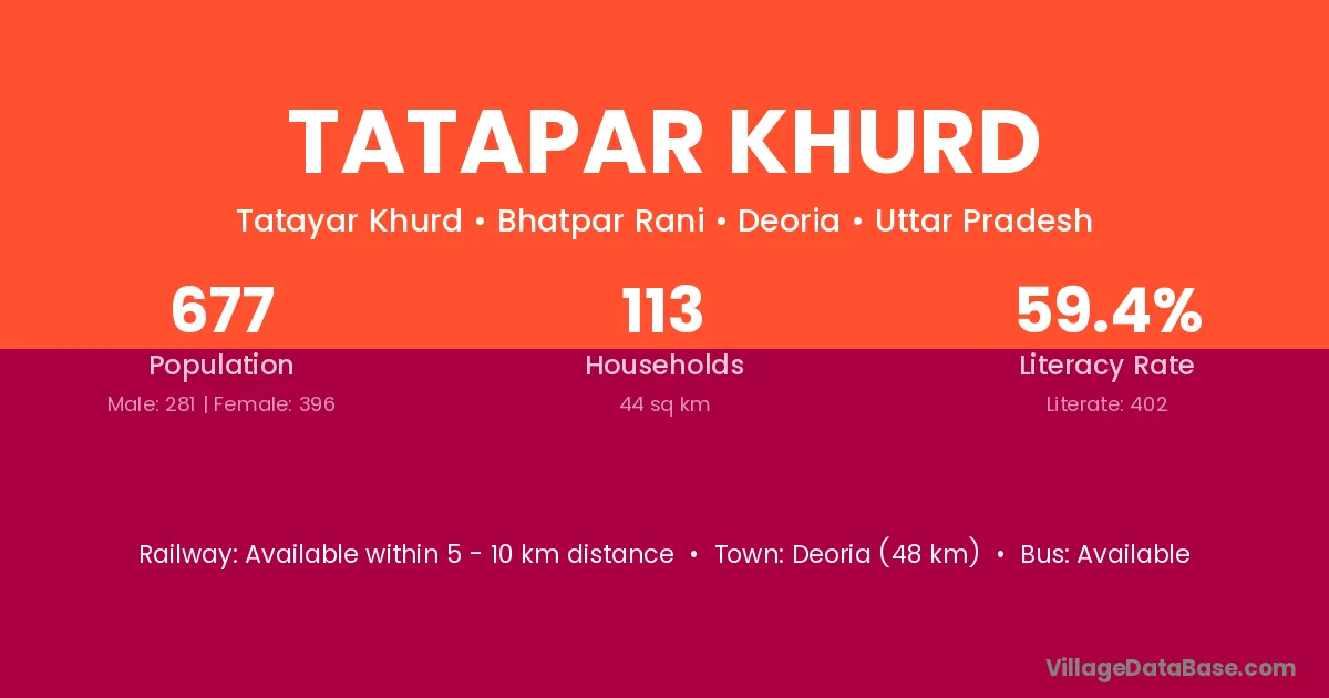 Deoria (48 km) is the nearest town to Tatapar Khurd village for major economic activities and is located approximately 48 km away.