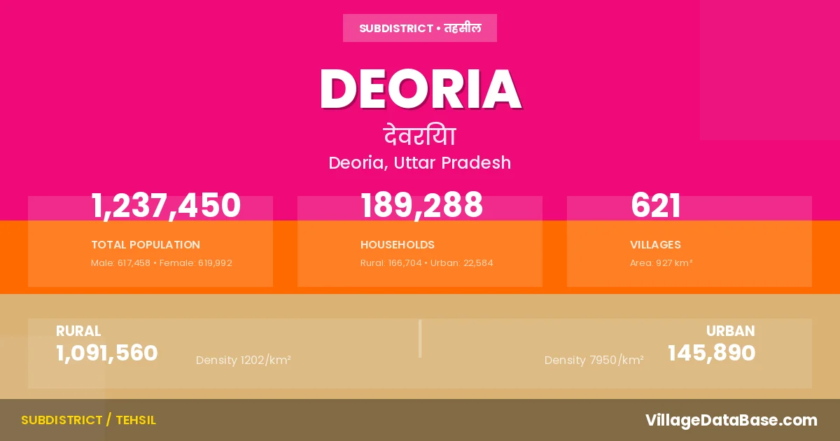 According to the 2011 census The total area of Deoria Tehsil is 927 km², with a population of 1237450 people. The population density is 1,336 inhabitants per square kilometre, and there are approximately 189288 houses in the sub district.