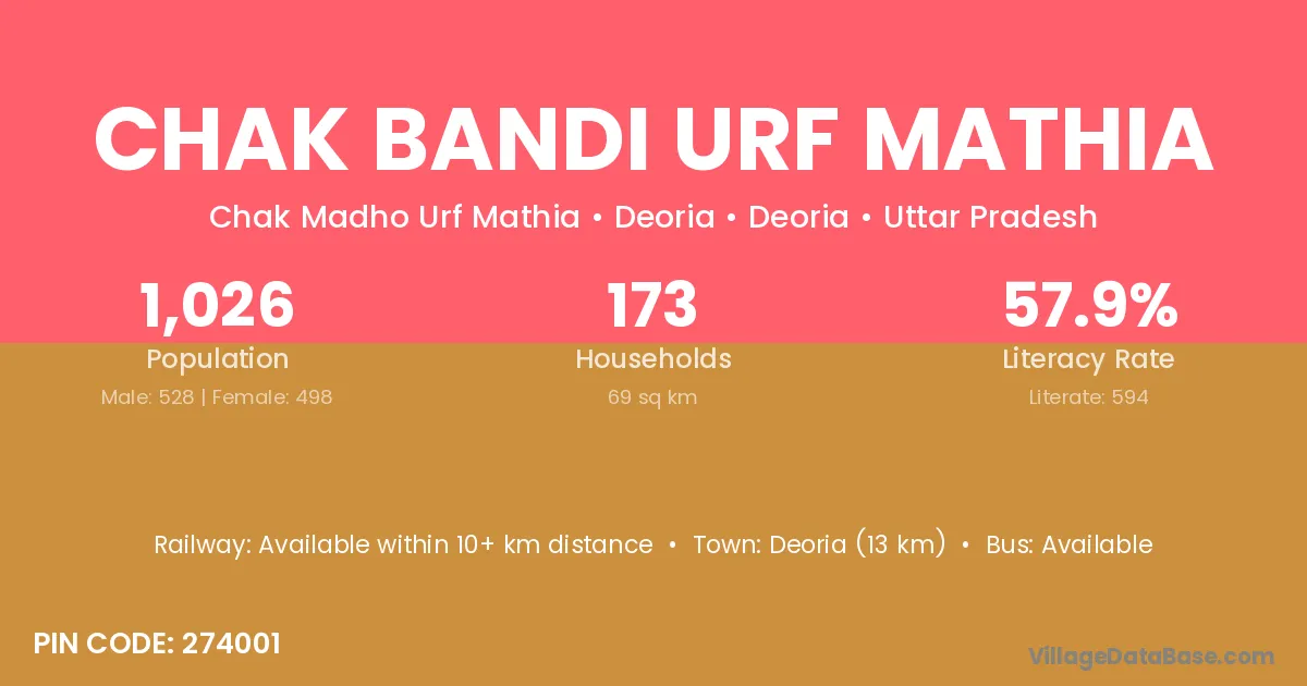 Deoria (13 km) is the nearest town to Chak Bandi Urf Mathia village for major economic activities and is located approximately 13 km away.