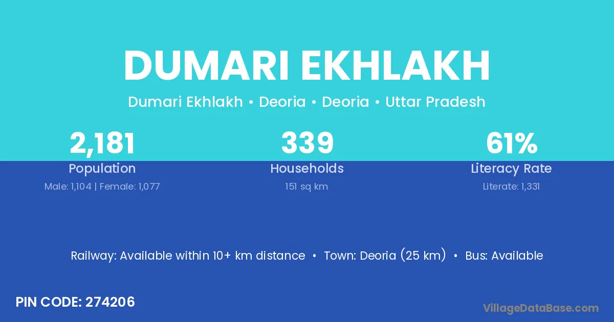 Deoria (25 km) is the nearest town to Dumari Ekhlakh village for major economic activities and is located approximately 25 km away.