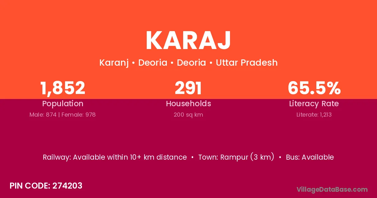 Karaj village has a total population of 1,852 people, of which 874 are males and 978 are females.