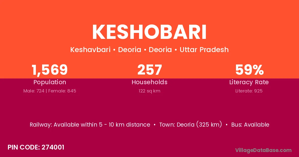 Deoria (325 km) is the nearest town to Keshobari village for major economic activities and is located approximately 325 km away.
