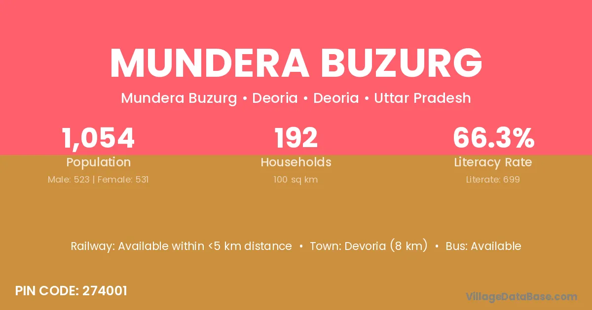 Devoria (8 km) is the nearest town to Mundera Buzurg village for major economic activities and is located approximately 8 km away.