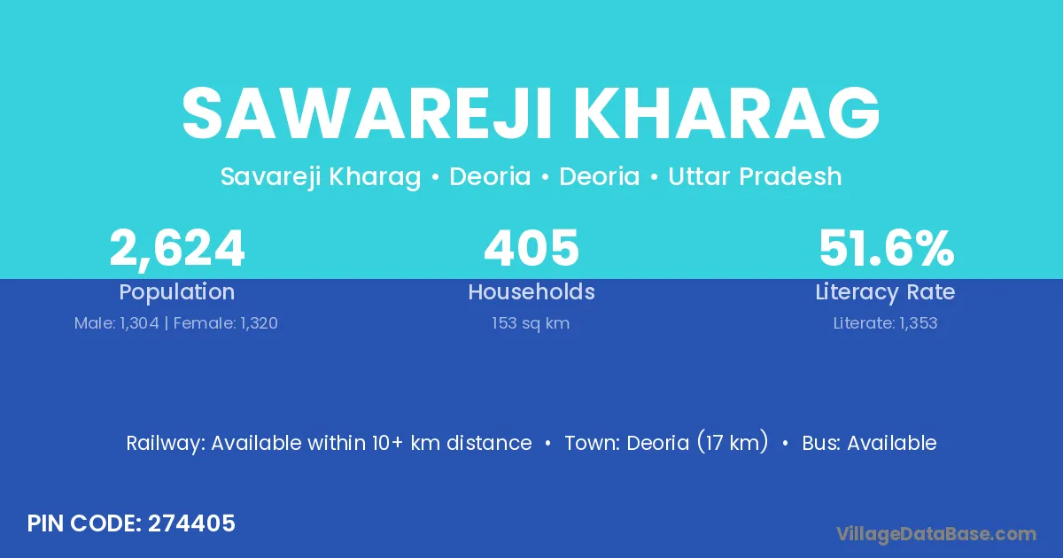Deoria (17 km) is the nearest town to Sawareji Kharag village for major economic activities and is located approximately 17 km away.