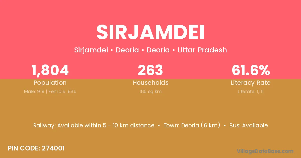 Deoria (6 km) is the nearest town to Sirjamdei village for major economic activities and is located approximately 6 km away.