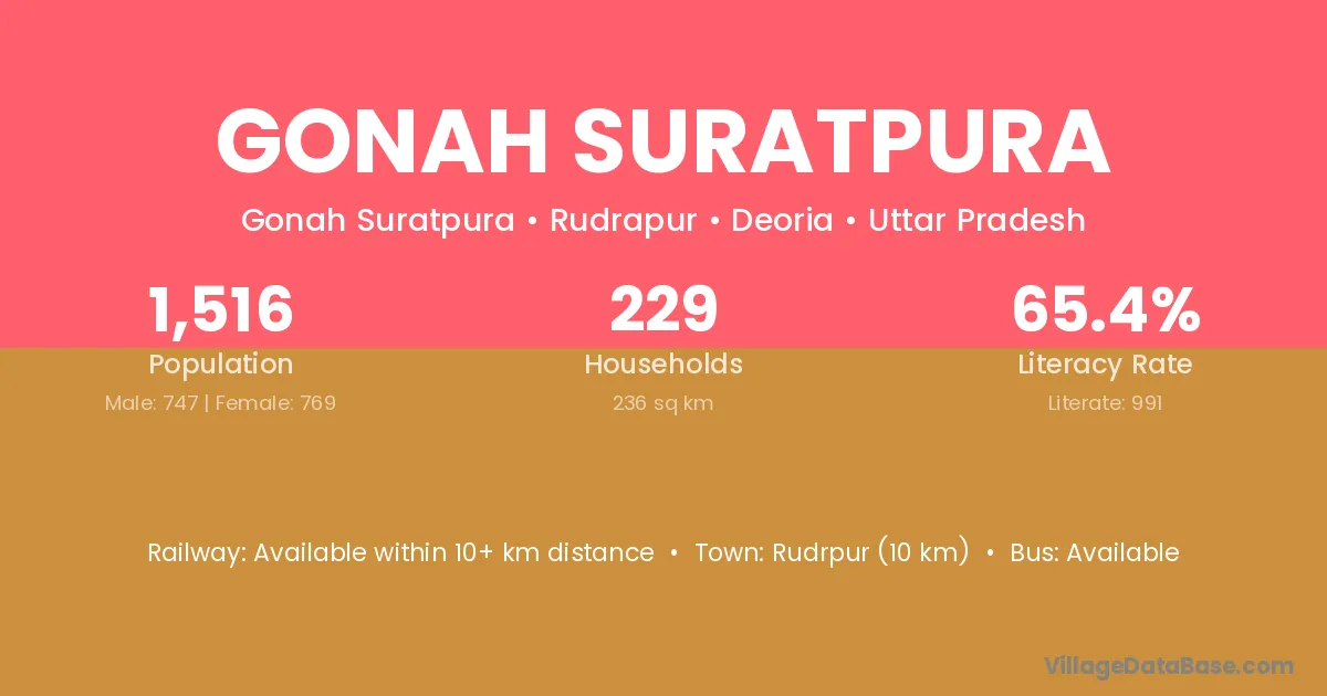 Rudrpur (10 km) is the nearest town to Gonah Suratpura village for major economic activities and is located approximately 10 km away.