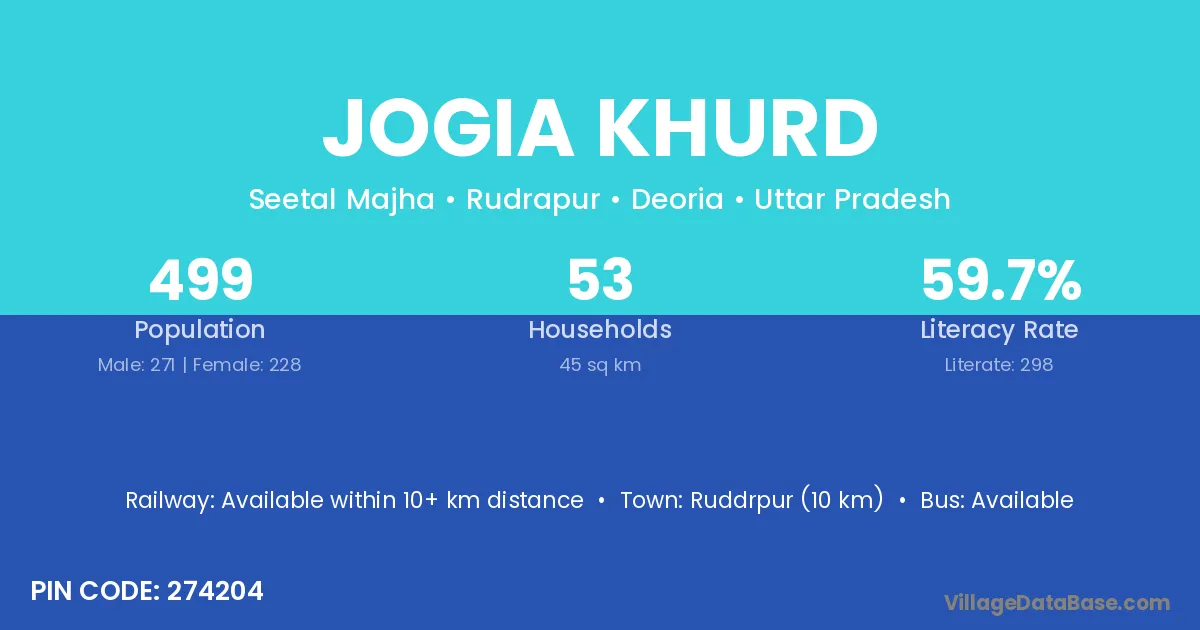 Jogia Khurd village has a total population of 499 people, of which 271 are males and 228 are females.