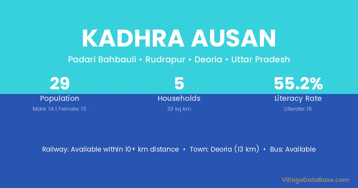 Deoria (13 km) is the nearest town to Kadhra Ausan village for major economic activities and is located approximately 13 km away.