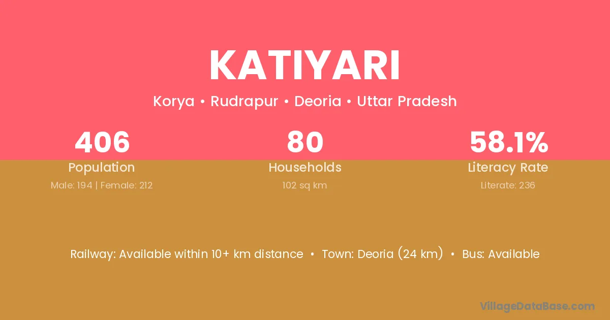 Deoria (24 km) is the nearest town to Katiyari village for major economic activities and is located approximately 24 km away.