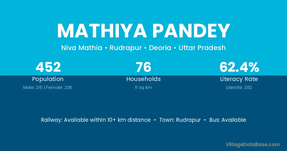 Mathiya Pandey village has a total population of 452 people, of which 216 are males and 236 are females.
