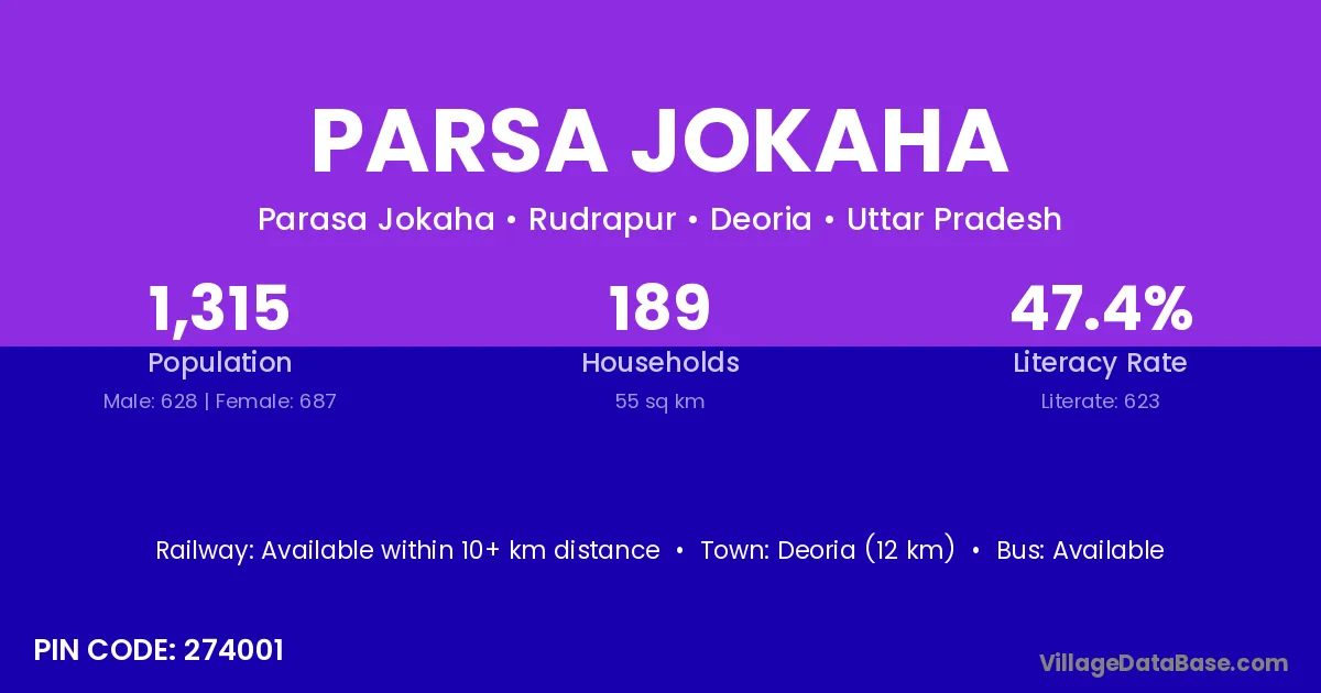 Deoria (12 km) is the nearest town to Parsa Jokaha village for major economic activities and is located approximately 12 km away.