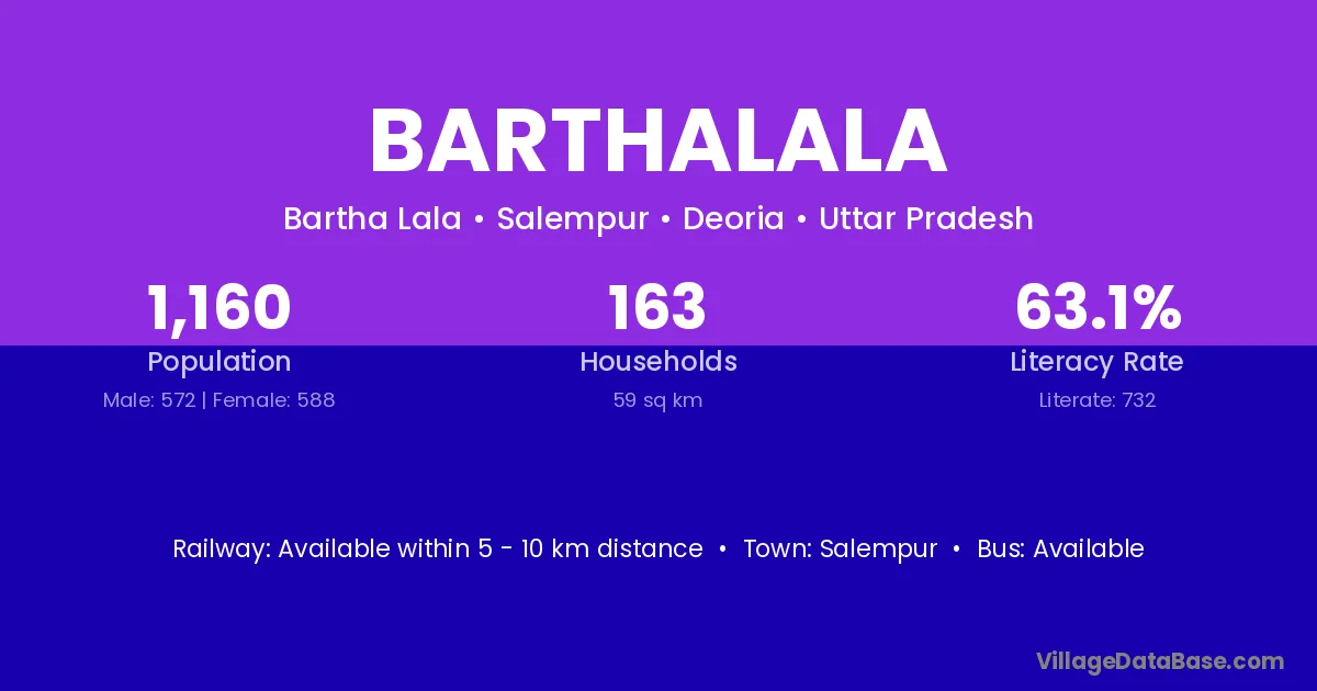 Barthalala village has a total population of 1,160 people, of which 572 are males and 588 are females.