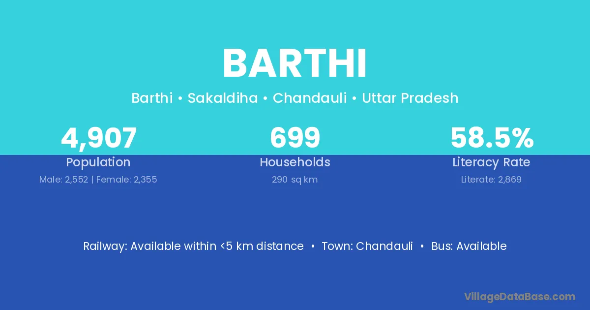 The literacy rate of Barthi village is 69.89%. Male literacy stands at 81.44% and female literacy at 55.70%.