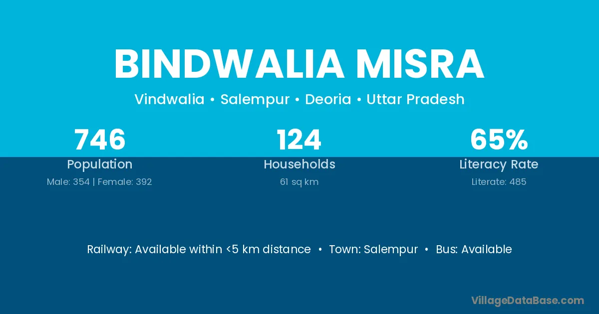 Bindwalia Misra village has a total population of 746 people, of which 354 are males and 392 are females.