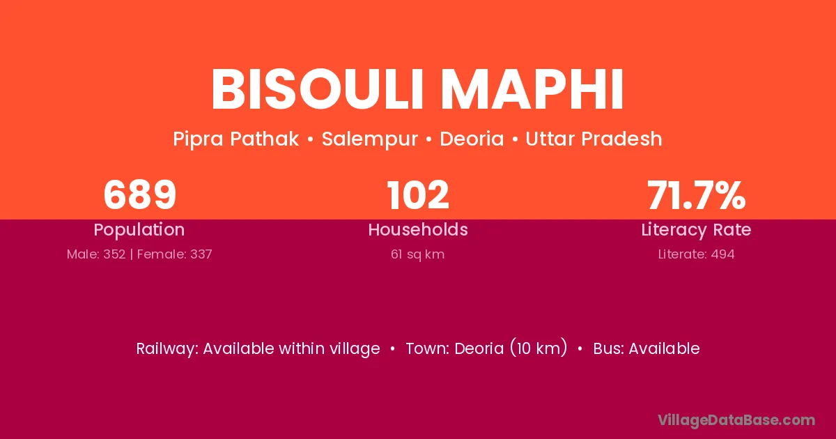 Deoria (10 km) is the nearest town to Bisouli Maphi village for major economic activities and is located approximately 10 km away.