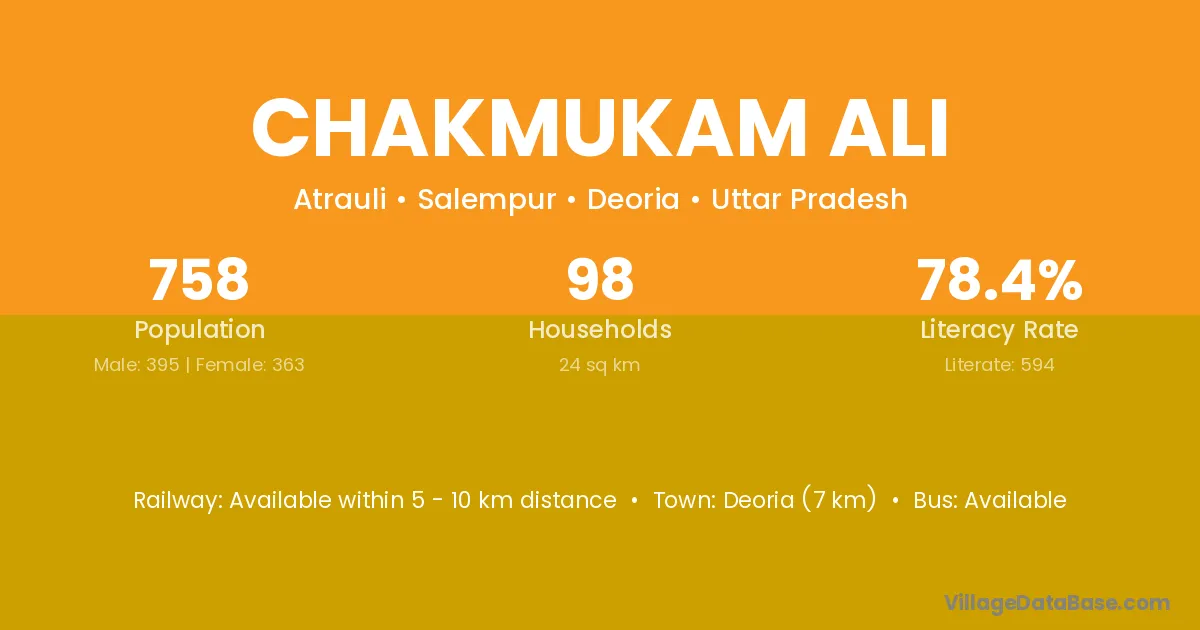 Deoria (7 km) is the nearest town to Chakmukam Ali village for major economic activities and is located approximately 7 km away.