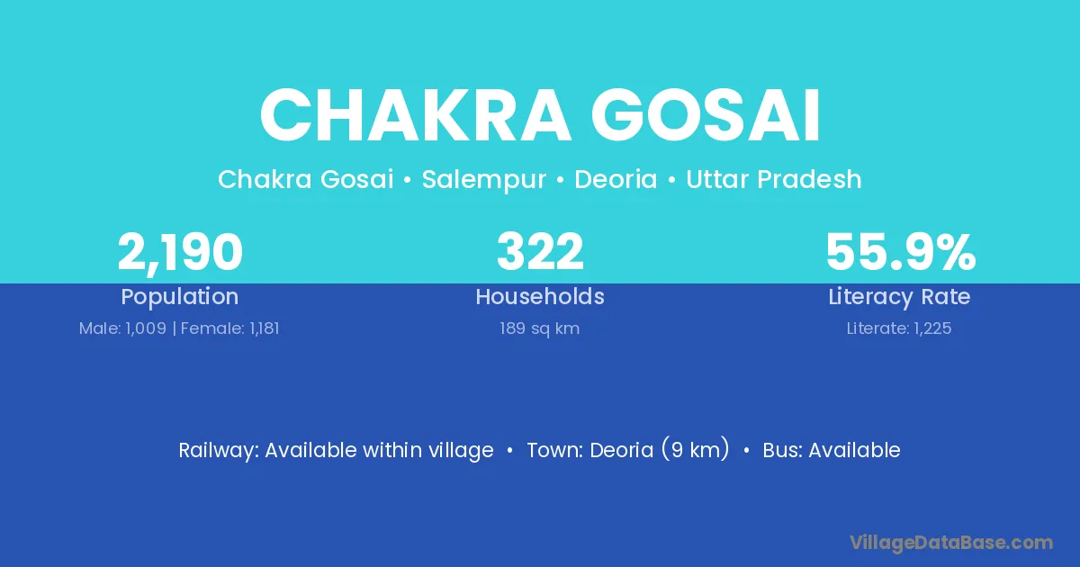 Chakra Gosai village has a total population of 2,190 people, of which 1,009 are males and 1,181 are females.