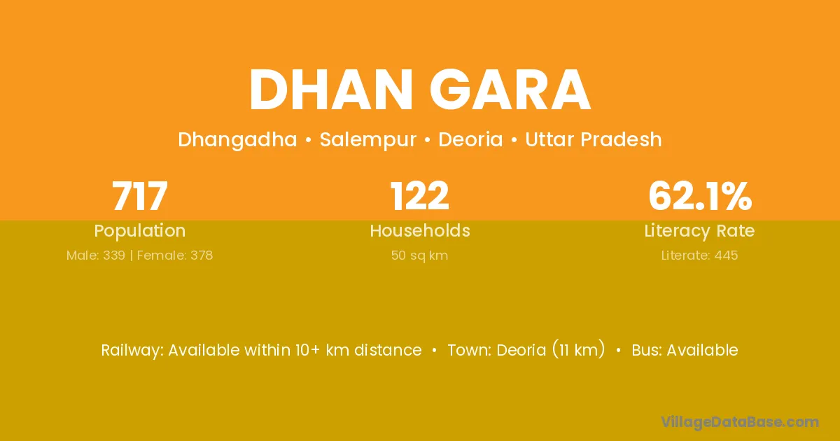 Deoria (11 km) is the nearest town to Dhan Gara village for major economic activities and is located approximately 11 km away.