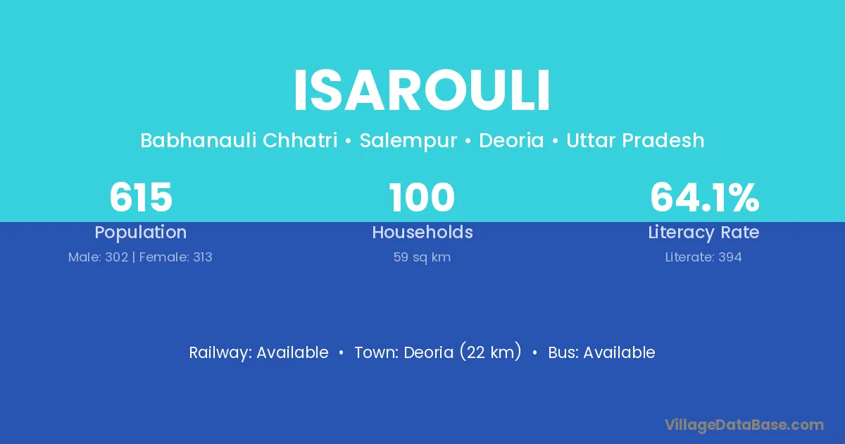 Deoria (22 km) is the nearest town to Isarouli village for major economic activities and is located approximately 22 km away.