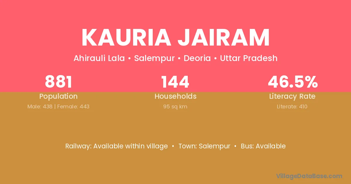 Kauria Jairam village has a total population of 881 people, of which 438 are males and 443 are females.