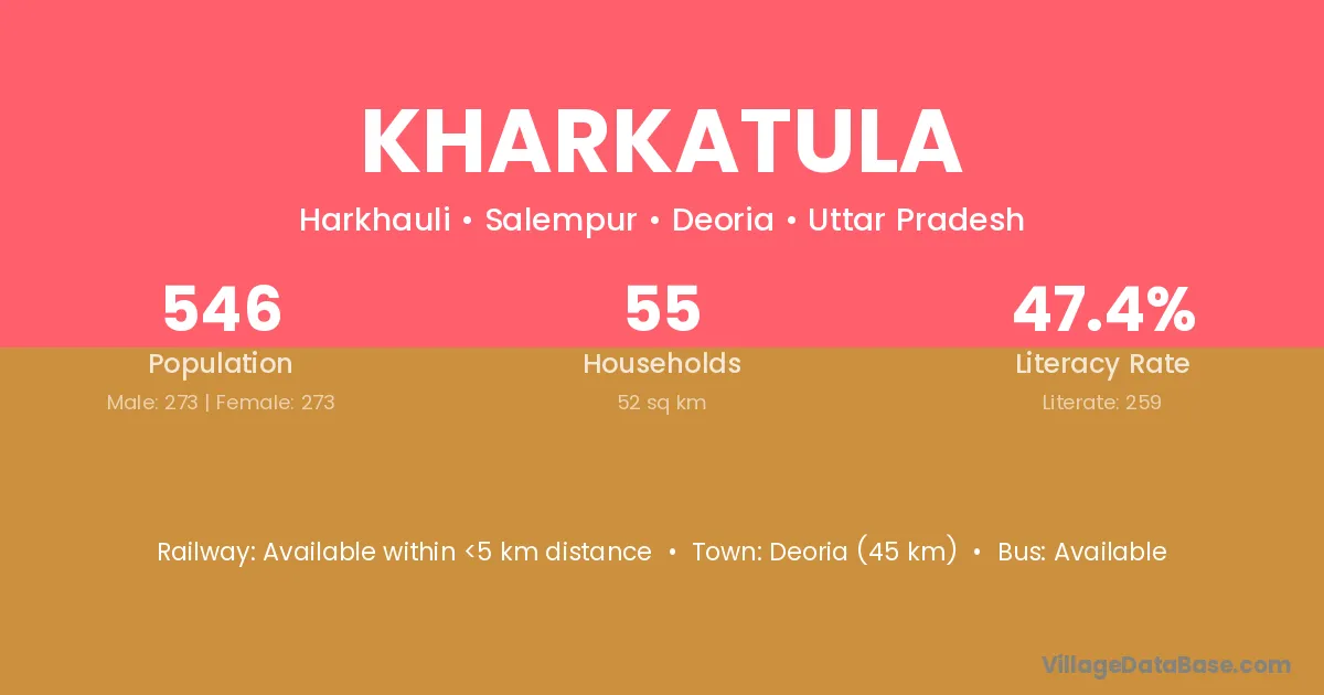 Deoria (45 km) is the nearest town to Kharkatula village for major economic activities and is located approximately 45 km away.