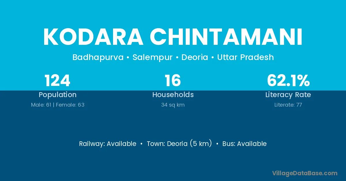 Deoria (5 km) is the nearest town to Kodara Chintamani village for major economic activities and is located approximately 5 km away.