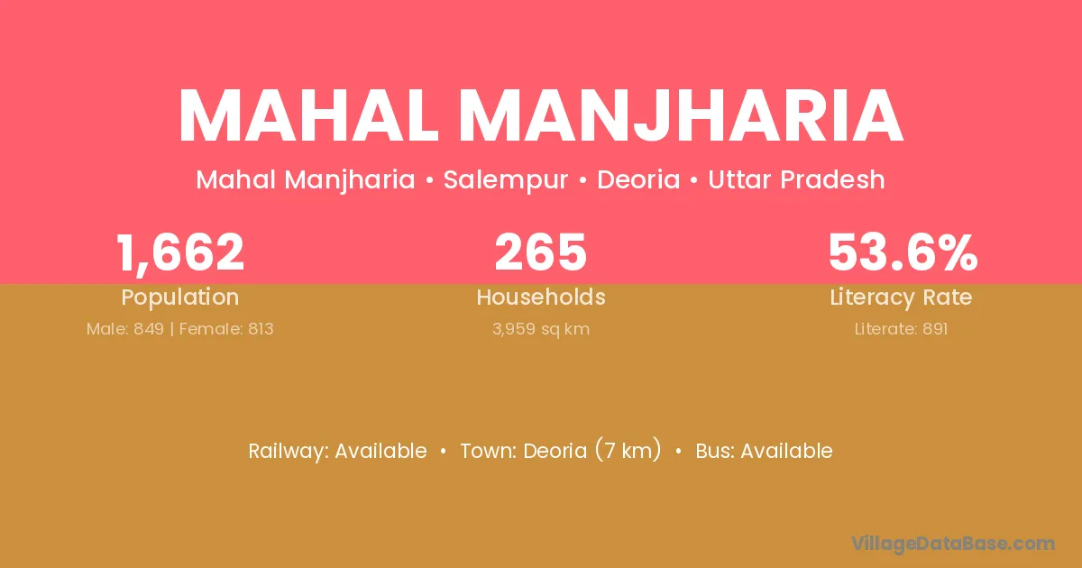 Deoria (7 km) is the nearest town to Mahal Manjharia village for major economic activities and is located approximately 7 km away.
