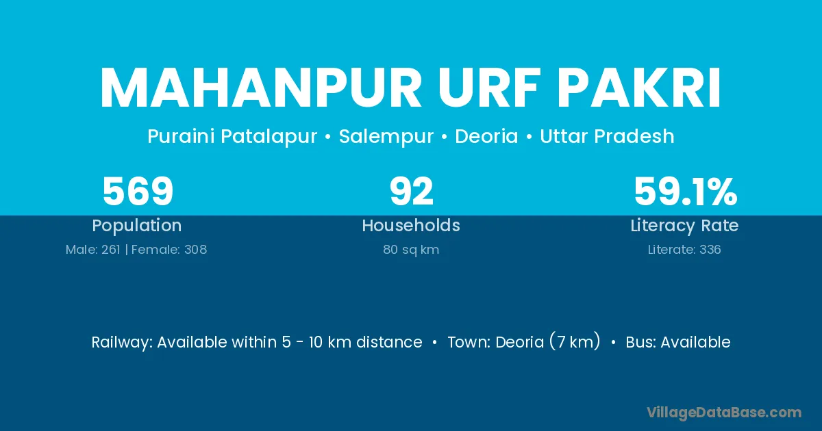 Deoria (7 km) is the nearest town to Mahanpur Urf Pakri village for major economic activities and is located approximately 7 km away.