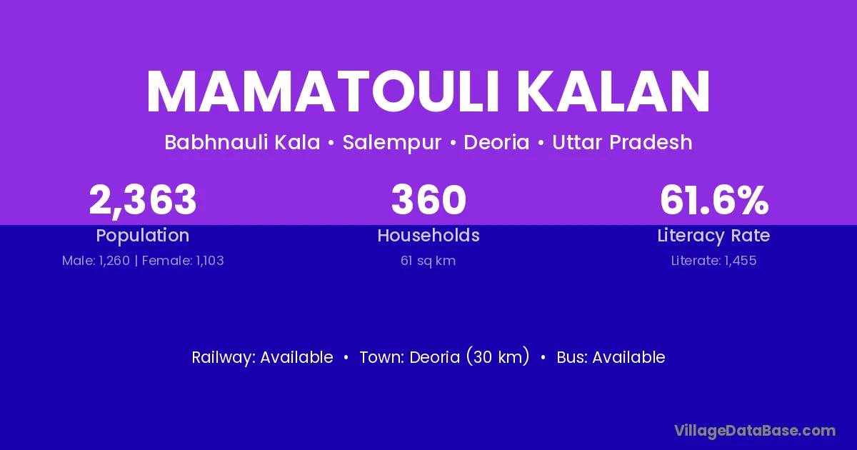 Deoria (30 km) is the nearest town to Mamatouli Kalan village for major economic activities and is located approximately 30 km away.