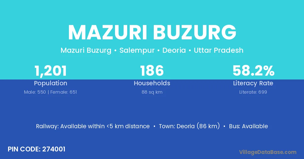 Deoria (86 km) is the nearest town to Mazuri Buzurg village for major economic activities and is located approximately 86 km away.