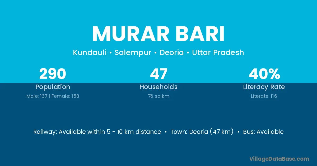 Deoria (47 km) is the nearest town to Murar Bari village for major economic activities and is located approximately 47 km away.