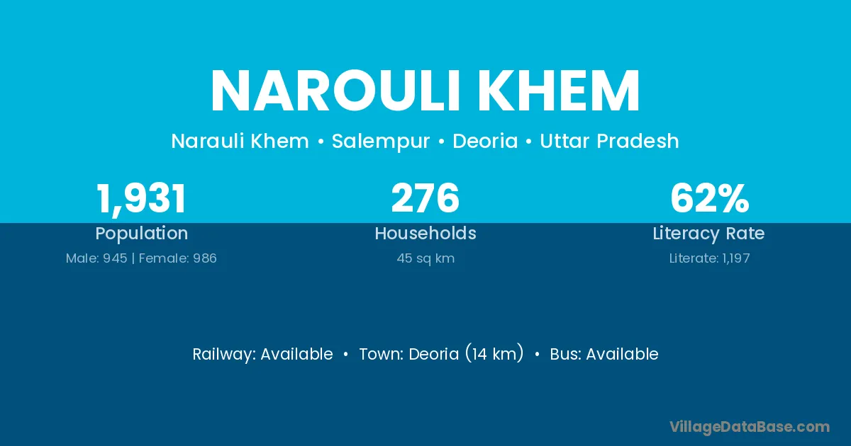 Deoria (14 km) is the nearest town to Narouli Khem village for major economic activities and is located approximately 14 km away.