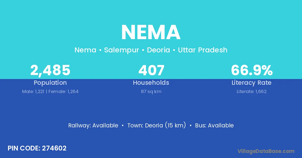 Deoria (15 km) is the nearest town to Nema village for major economic activities and is located approximately 15 km away.