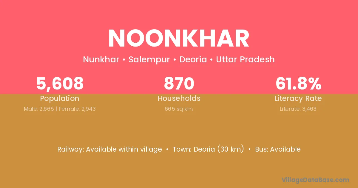 Deoria (30 km) is the nearest town to Noonkhar village for major economic activities and is located approximately 30 km away.