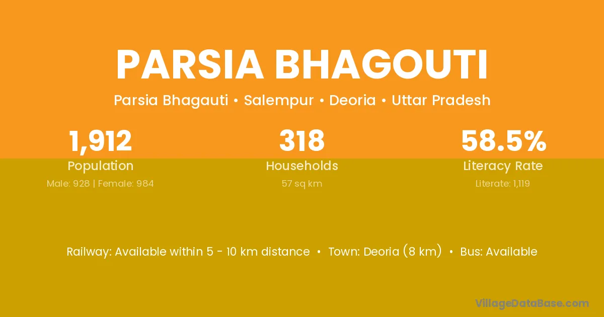 Deoria (8 km) is the nearest town to Parsia Bhagouti village for major economic activities and is located approximately 8 km away.