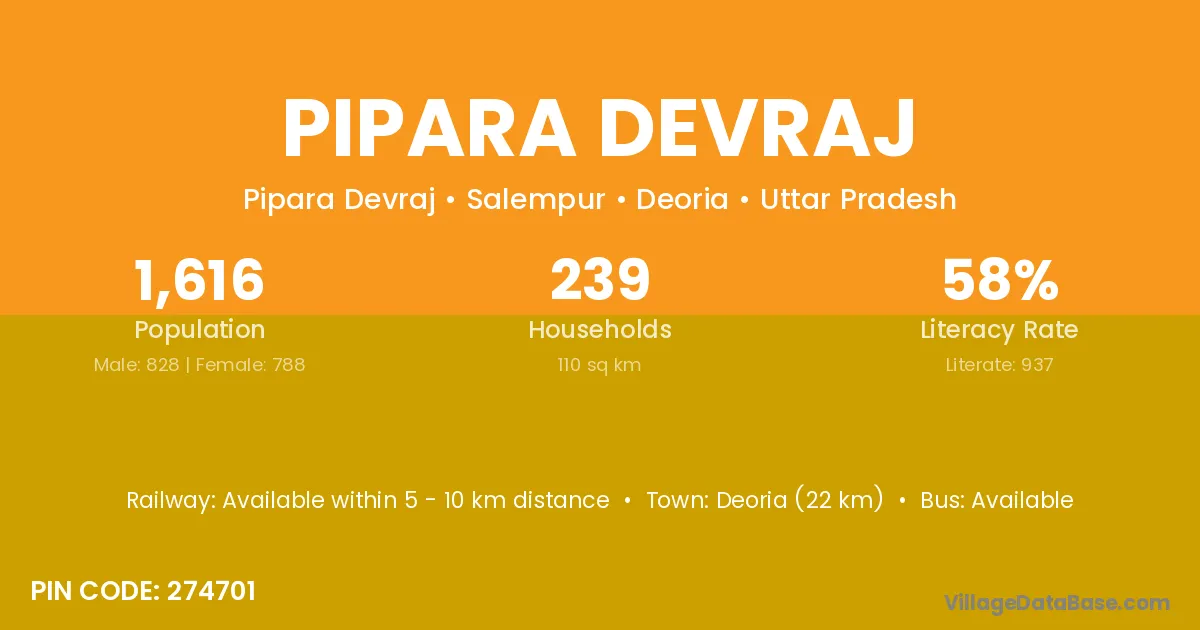 Deoria (22 km) is the nearest town to Pipara Devraj village for major economic activities and is located approximately 22 km away.