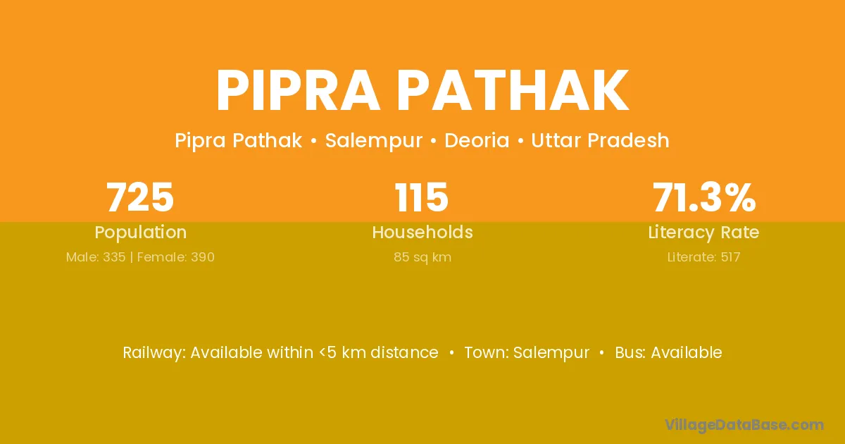Pipra Pathak village has a total population of 725 people, of which 335 are males and 390 are females.