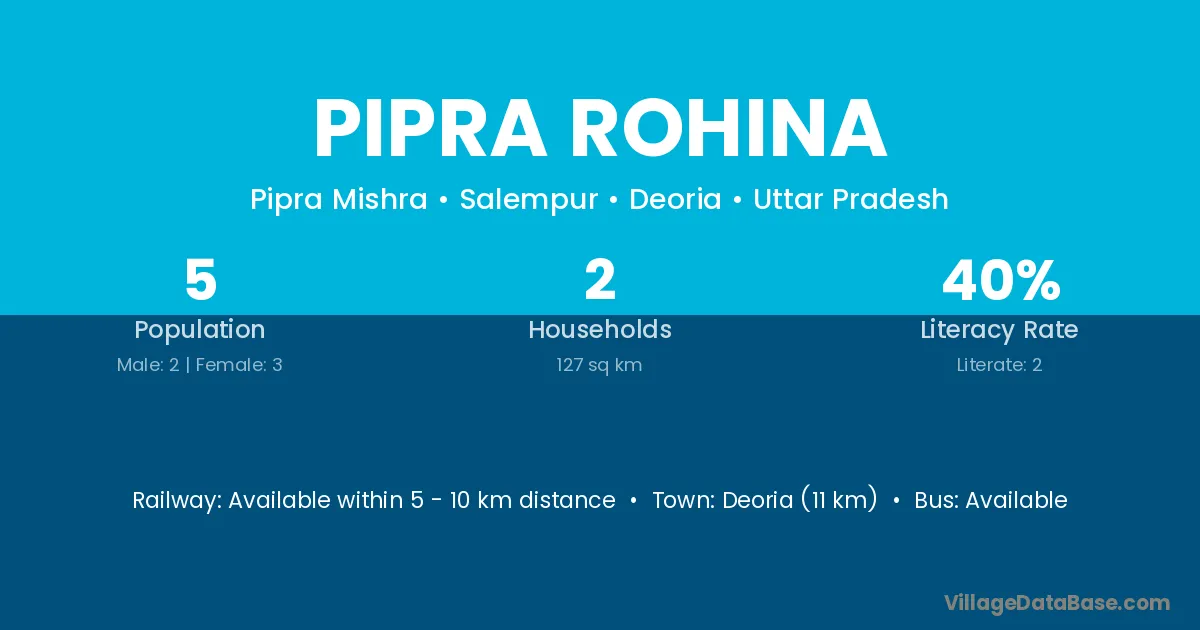 Deoria (11 km) is the nearest town to Pipra Rohina village for major economic activities and is located approximately 11 km away.
