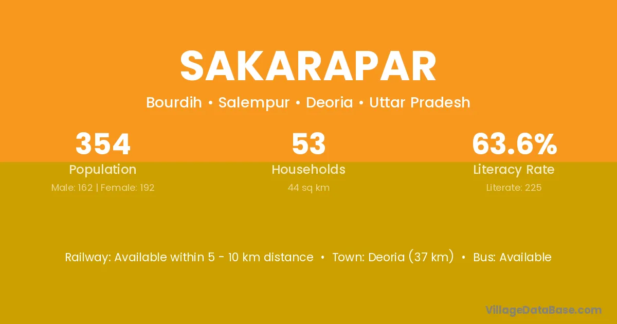 Deoria (37 km) is the nearest town to Sakarapar village for major economic activities and is located approximately 37 km away.