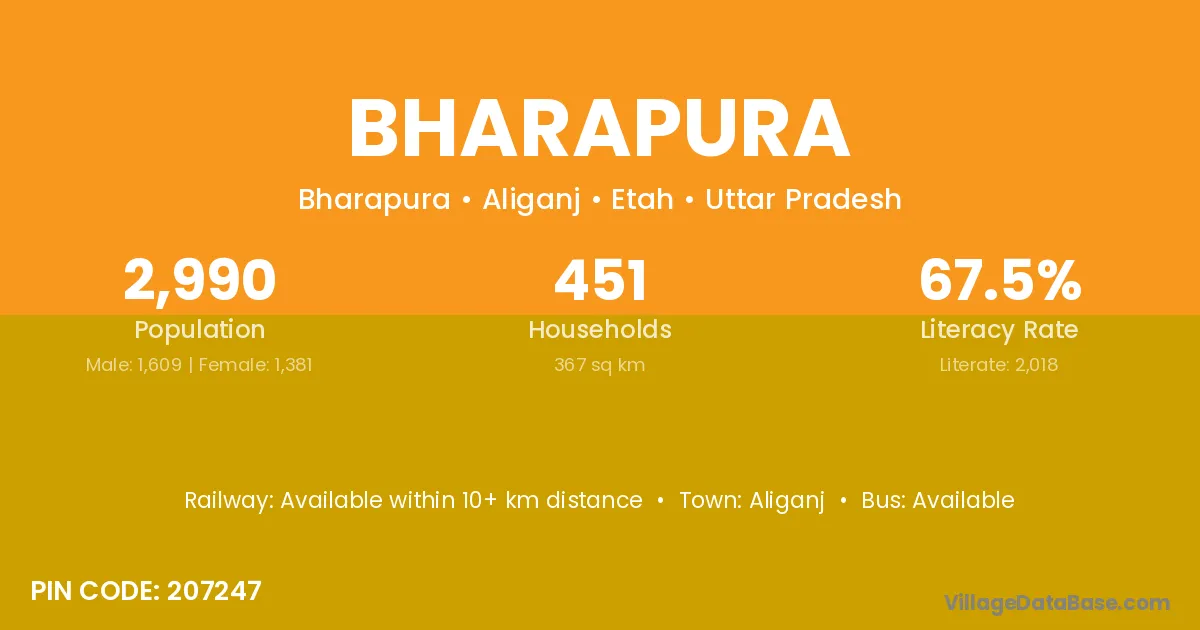 Aliganj is the nearest town to Bharapura village for major economic activities