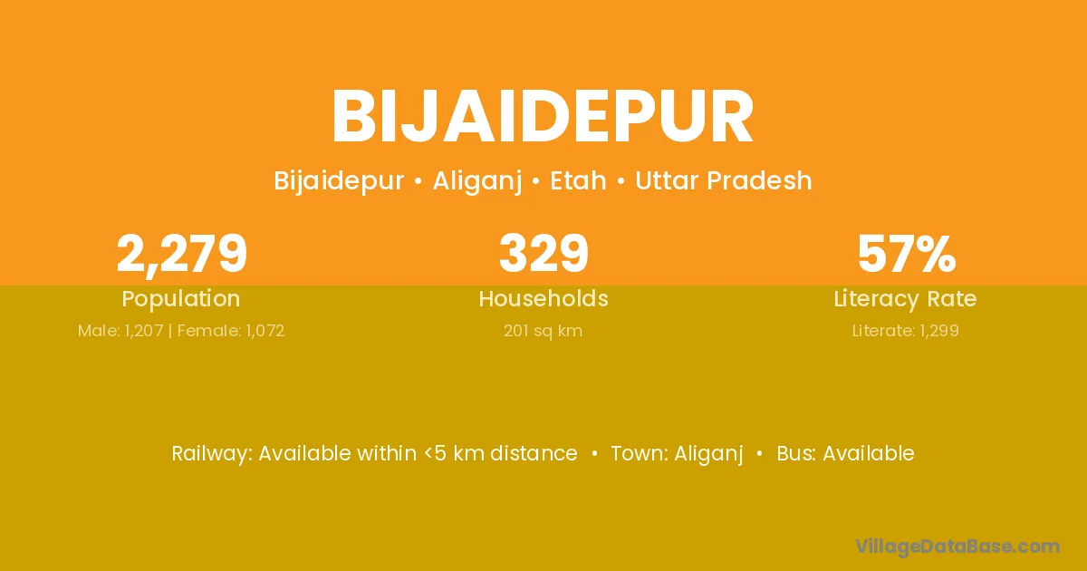 Bijaidepur village has a total population of 2,279 people, of which 1,207 are males and 1,072 are females.