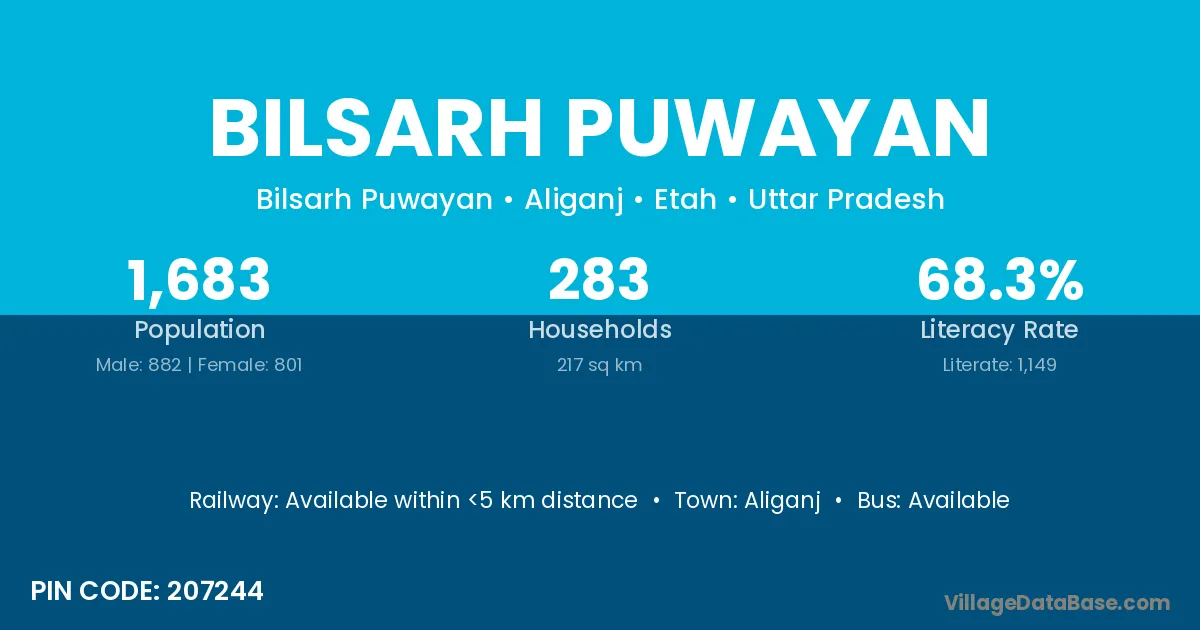 Bilsarh Puwayan village has a total population of 1,683 people, of which 882 are males and 801 are females.