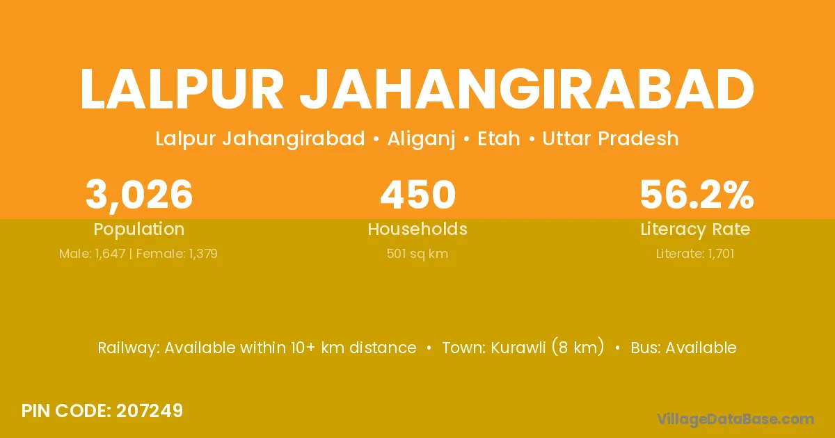 Kurawli (8 km) is the nearest town to Lalpur Jahangirabad village for major economic activities and is located approximately 8 km away.