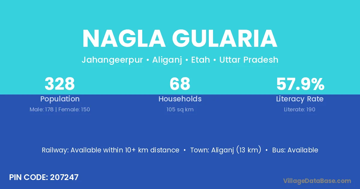 Aliganj (13 km) is the nearest town to Nagla Gularia village for major economic activities and is located approximately 13 km away.