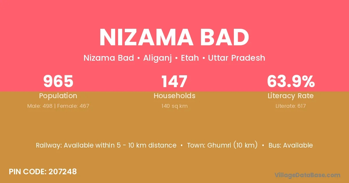 Nizama Bad village has a total population of 965 people, of which 498 are males and 467 are females.