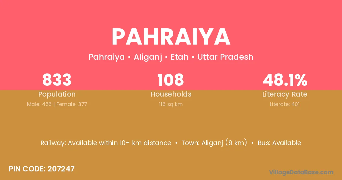 Aliganj (9 km) is the nearest town to Pahraiya village for major economic activities and is located approximately 9 km away.