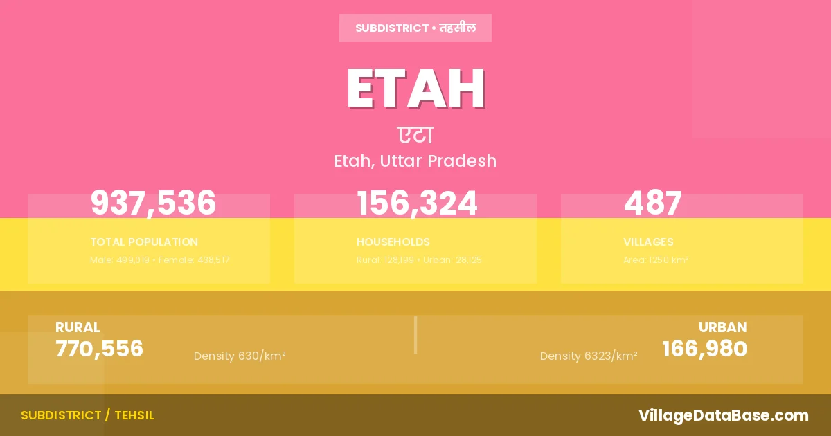 According to the 2011 census The total area of Etah Tehsil is 1250 km², with a population of 937536 people. The population density is 750 inhabitants per square kilometre, and there are approximately 156324 houses in the sub district.