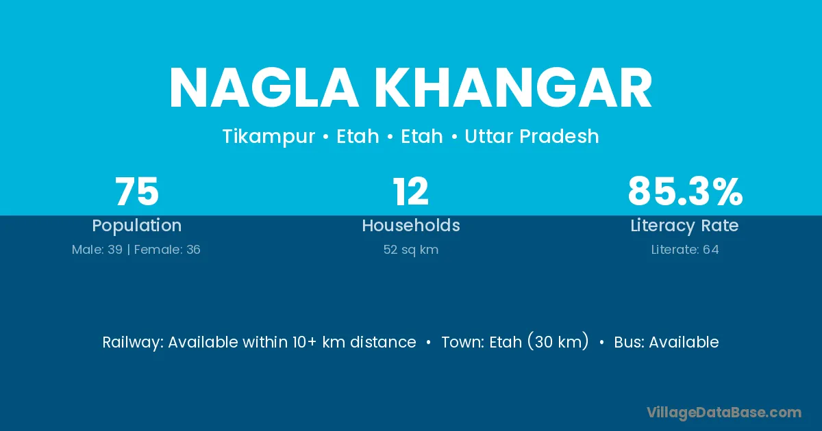 Etah (30 km) is the nearest town to Nagla Khangar village for major economic activities and is located approximately 30 km away.
