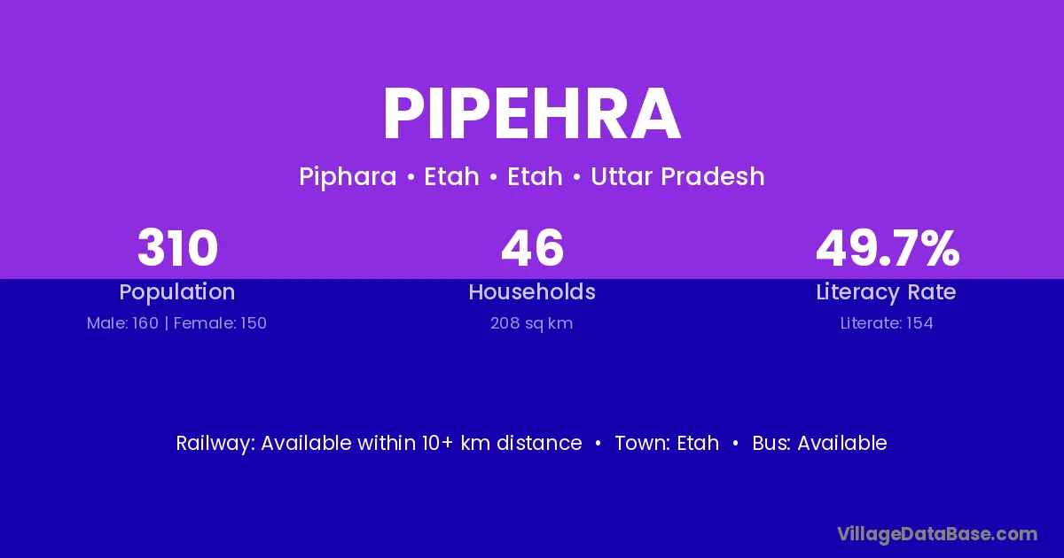 The literacy rate of Pipehra village is 49.68%. Male literacy stands at 53.13% and female literacy at 46.00%.