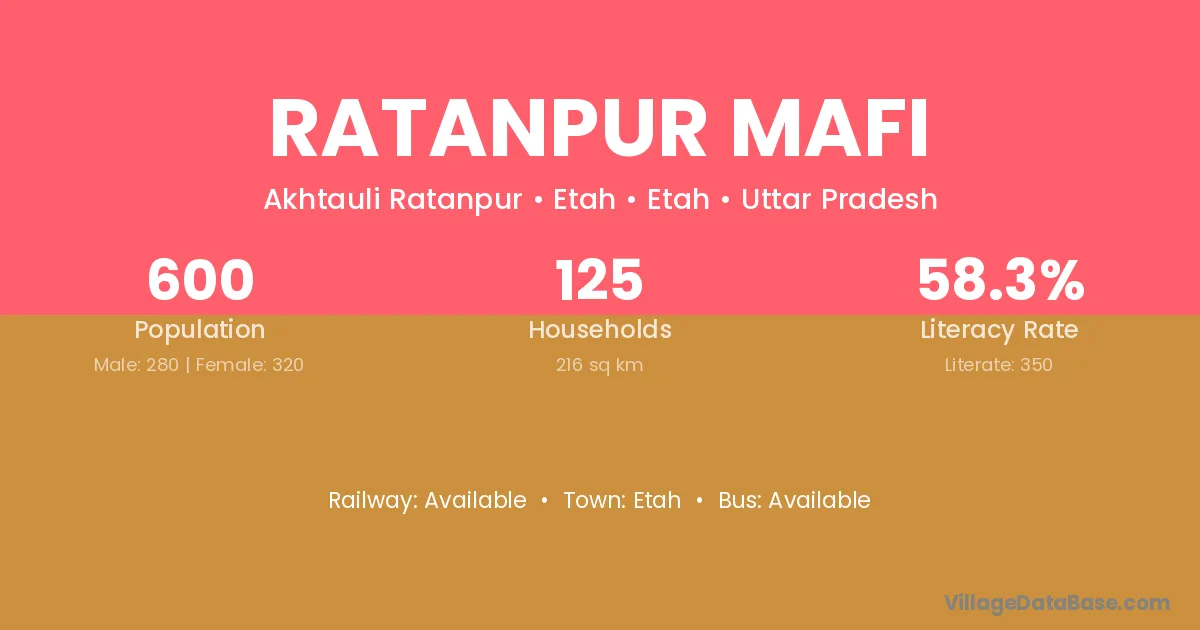Etah is the nearest town to Ratanpur Mafi village for major economic activities